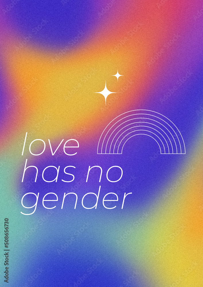 LGBTQ+ poster on gradient texture background. Textured background in lgbt colours. "Love has no gender" quote. #508656730