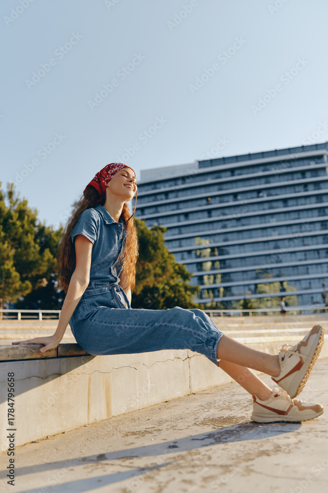 lifestyle woman in modern boho-western denim street style sitting outdoors enjoying sunny day with relaxed pose and film color tones #1784795658