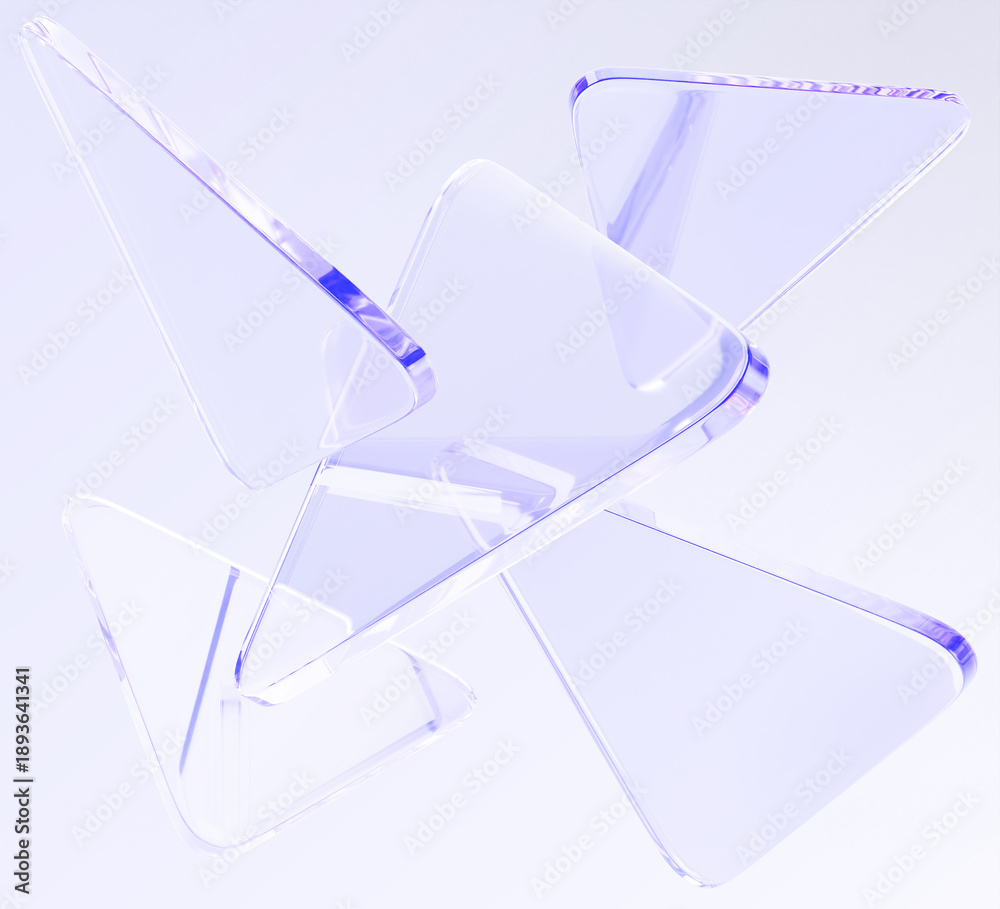 Light purple glass triangle 3d shapes flying on pastel render background. Abstract bg with transparent triangular plates, crystal glossy figures and motion effect. Tech wallpaper. 3D illustration #1893641341