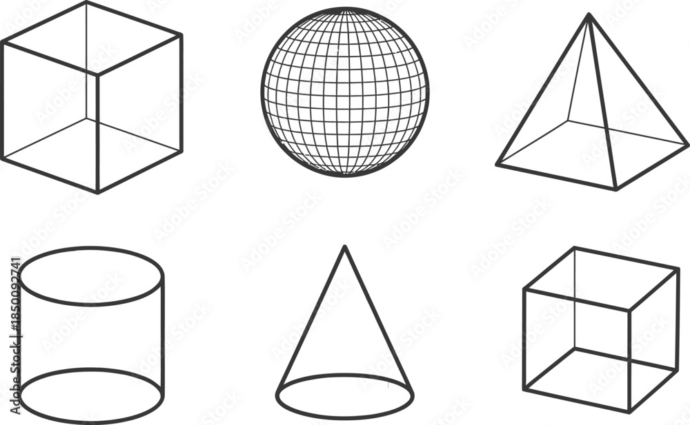 Line art vector set of 6 geometric shapes cube sphere pyramid cylinder cone and prism #1850092741