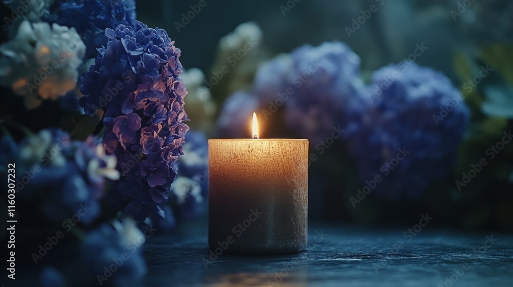 Lit candle surrounded by blue hydrangeas. #1160307232