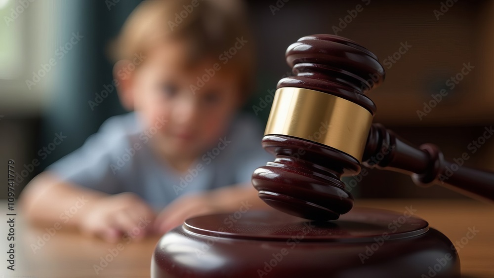 Little boy is behind judge's gavel. Blurred background #1097417779
