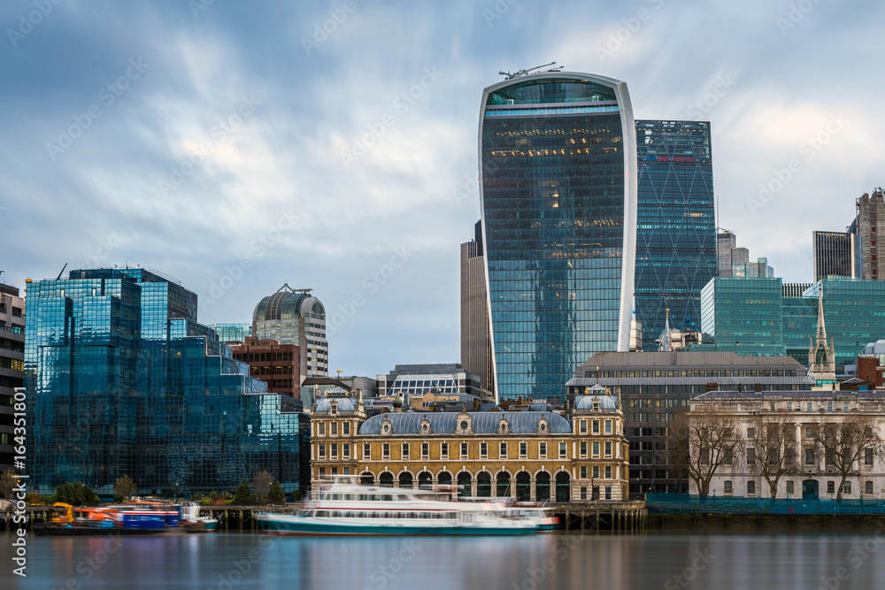 London, England - Panoramic skyline view of the famous Bank district of central London with skyscrapers, boats and blue sky #164351801