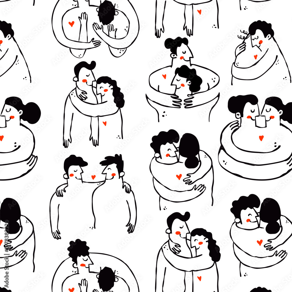 Love and human support naive seamless pattern bold line vector isolated cute illustrations of people hugging and red hearts for sticker print and branding #1978382220