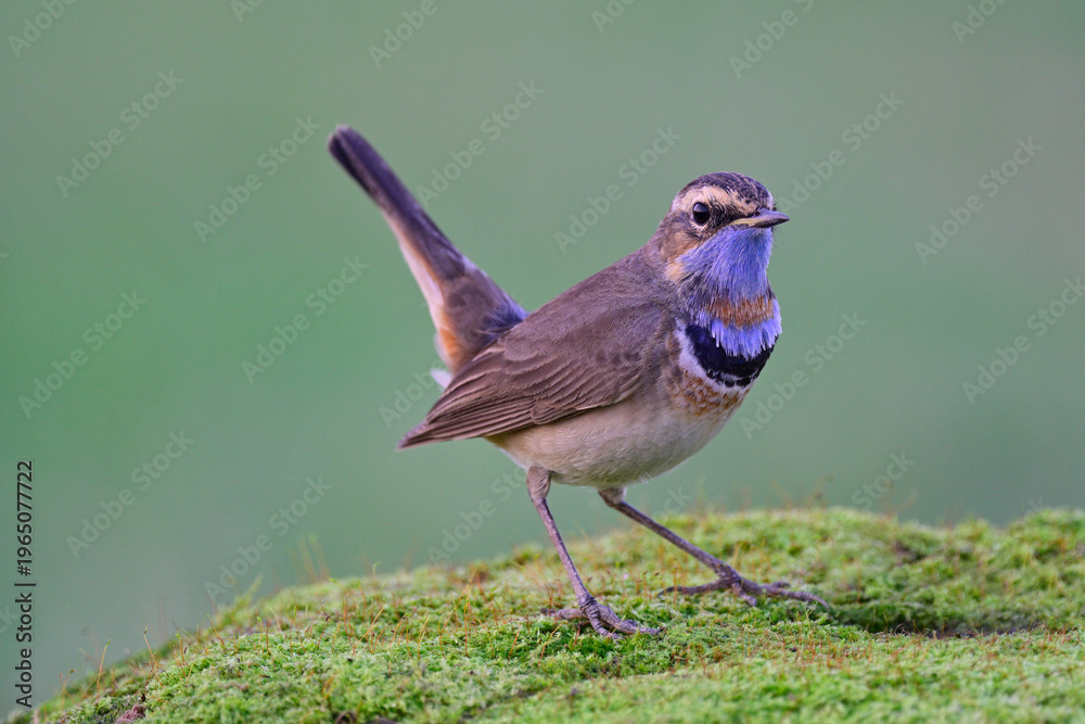 Luscinia svecica, colorful bird doing its tail wagging while foraging on nice green moss ground,, bluethroat bird #1965077722