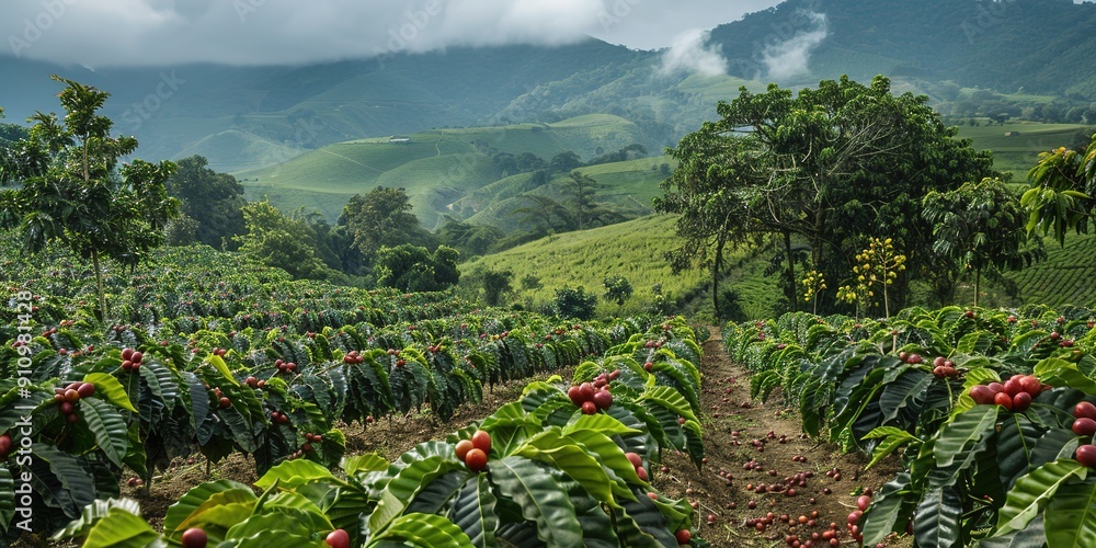Lush green coffee plantation with ripe red berries and scenic hi #910981428