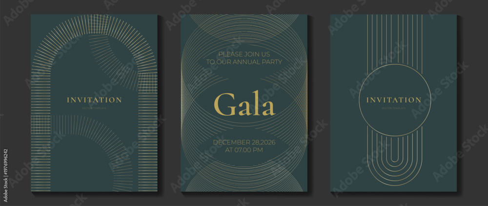 Luxury gala invitation card background vector. Golden elegant gradient gold line pattern on black and light background. Premium design illustration for wedding and vip cover template, grand opening. #1976996242