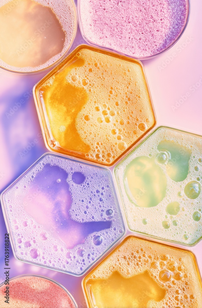 Macro composition of hexagonal cells filled with organic materials and liquid textures #1763918822