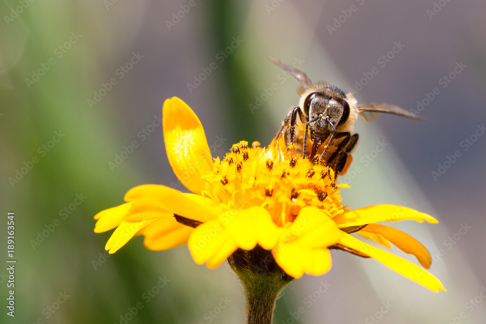 Macro photography of pollinator honey bee drinking nectar from yellow wild flower with proboscis extending into the flower and simultaneously bringing pollen from one flower to another. #189163541