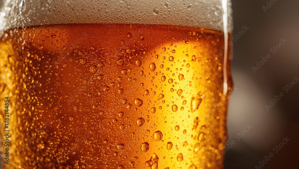 Macro shot of a chilled beer bottle covered in condensation and water droplets on the glass surface #1782144354