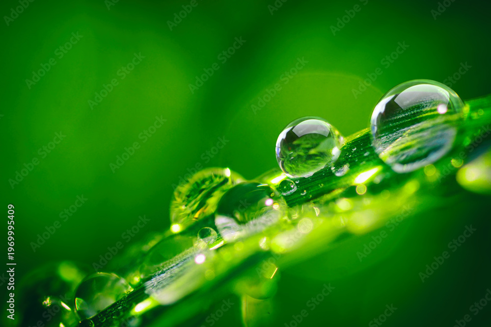 Macro shot of crystal clear dew drops resting on a vibrant green blade of grass. A fresh and detailed spring nature scene with soft morning light and a beautiful blurred bokeh background. #1969995409