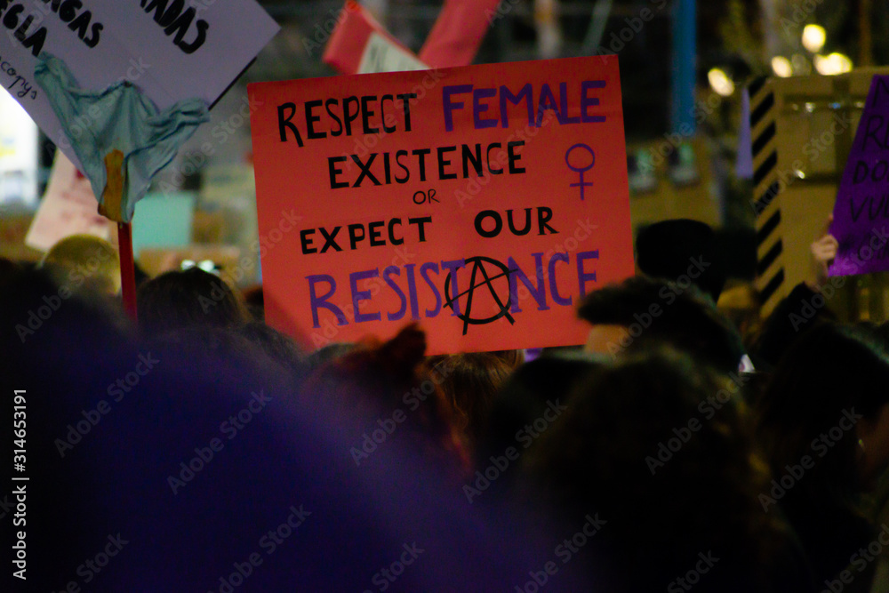 MADRID, SPAIN - MARCH 8, 2019: Massive feminist protest on 8M in favour of women's rights and equality in society. Protest posters could be seen during the demonstration #314653191