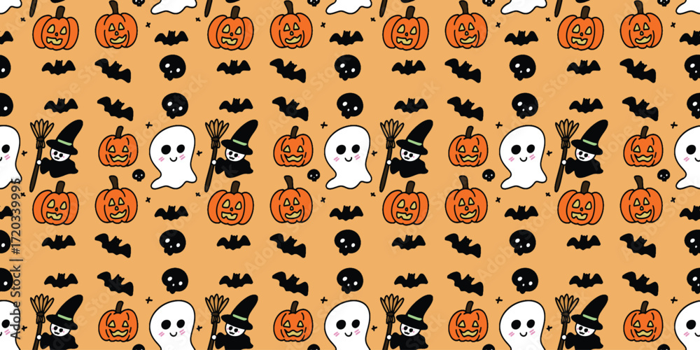 magical Halloween elements and seamless pattern. Skull, bones, bat, spider, web, Skeleton, pumpkin, jack-o'-lantern, ghost, skull, bat, hat, sweets. Design for wrapping paper, print, Halloween party #1720339995