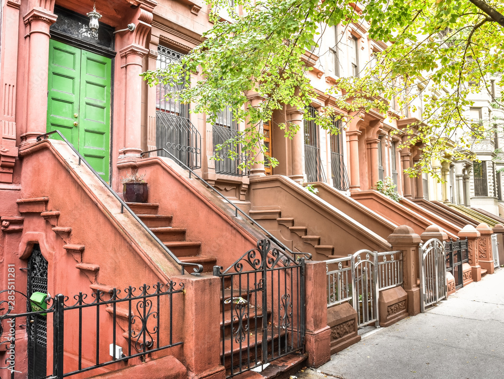 Main ladder and entry door. New york Harlem buildings. Brown houses. NYC, USA. #285511281
