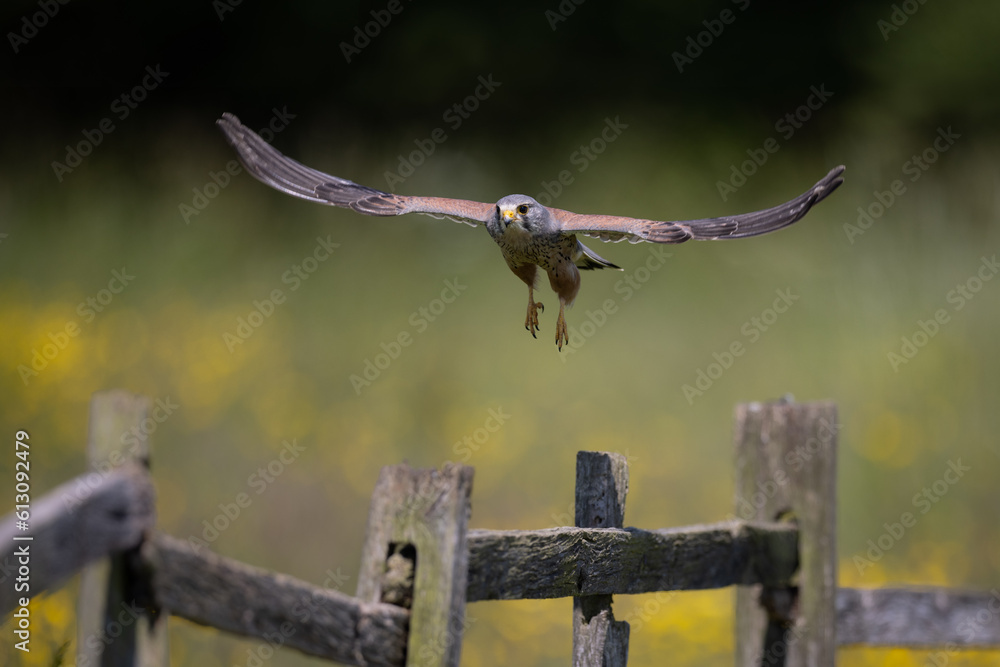 Male Common Kestrel in flight above fence posts with a green background. #613092479