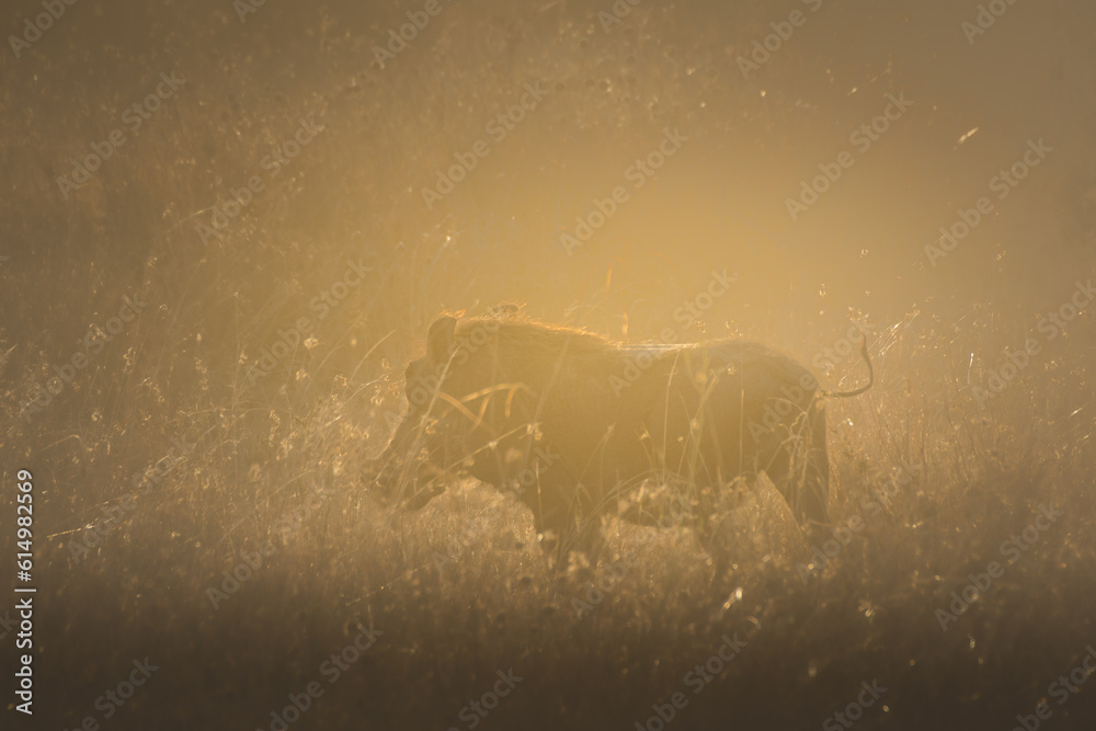 Male Common Warthog (Phacochoerus africanus) backlit in the grasslands of Serengeti National Park. Tanzania. #614982569