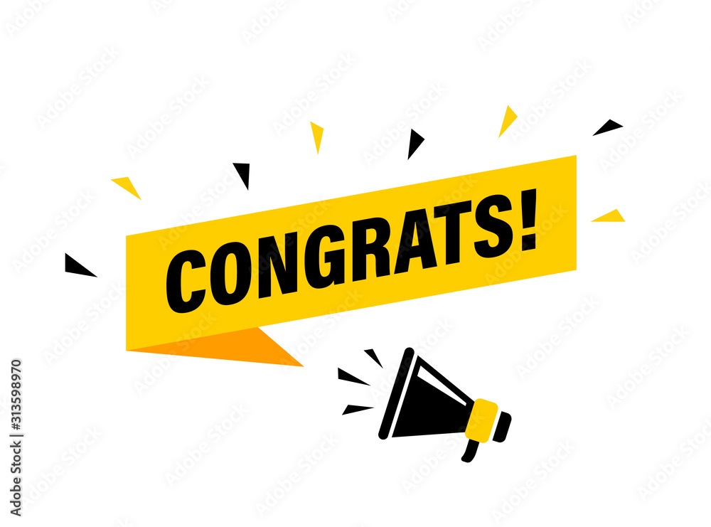 Male hand holding megaphone with congrats speech bubble. Loudspeaker. Banner for business, marketing and advertising. Vector illustration. #313598970