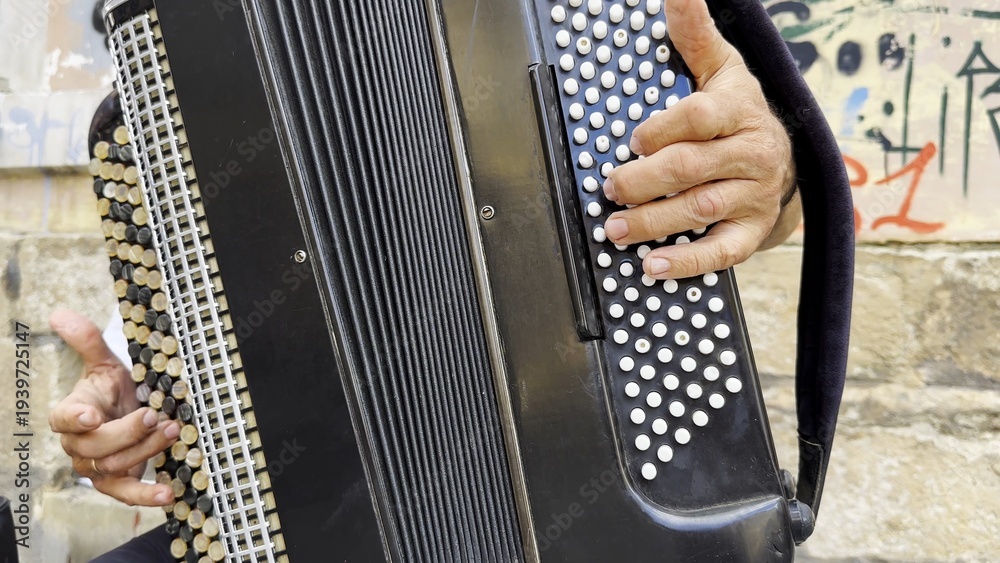 Male hands of musician playing the accordion at urban street. The detailed view highlights texture of instrument, capturing rhythm, tradition, and the expressive character of live music performance #1939725147