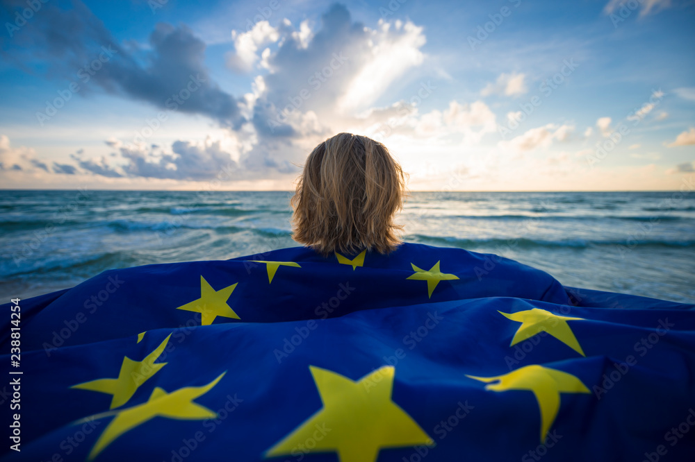 Man holding a fluttering iconic EU flag with circle of stars on beach with stormy turbulent seas in the channel at sunrise #238814254