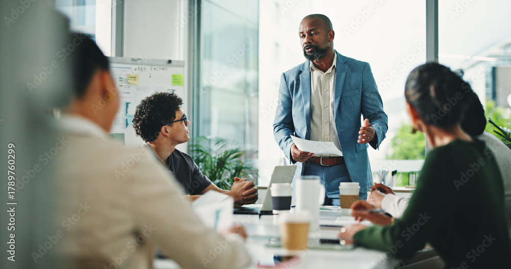 Man, presentation and group at office meeting, talk and review with documents at finance company. Person, speaker and paperwork with team, feedback and planning for strategy at investment agency #1789760299