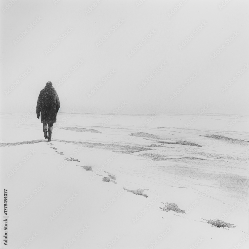 Man walking alone on snowy landscape in foggy winter atmosphere #1779491077