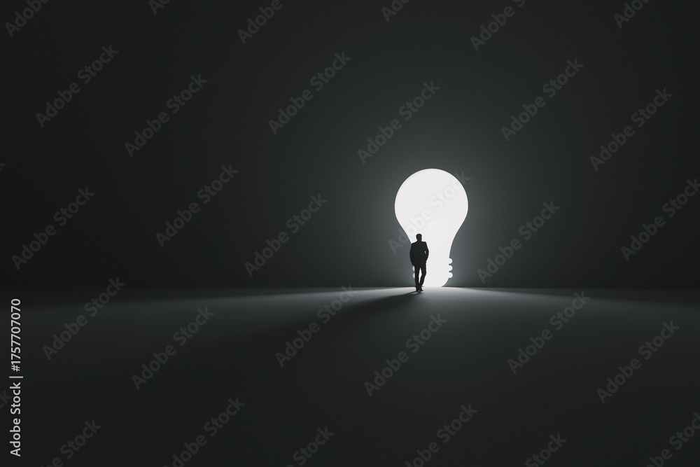 Man walking toward a giant glowing light bulb door. Innovation, creativity, and new ideas. Concept of inspiration, success, leadership, and thinking outside the box in a dark space. Career, creative #1757707070