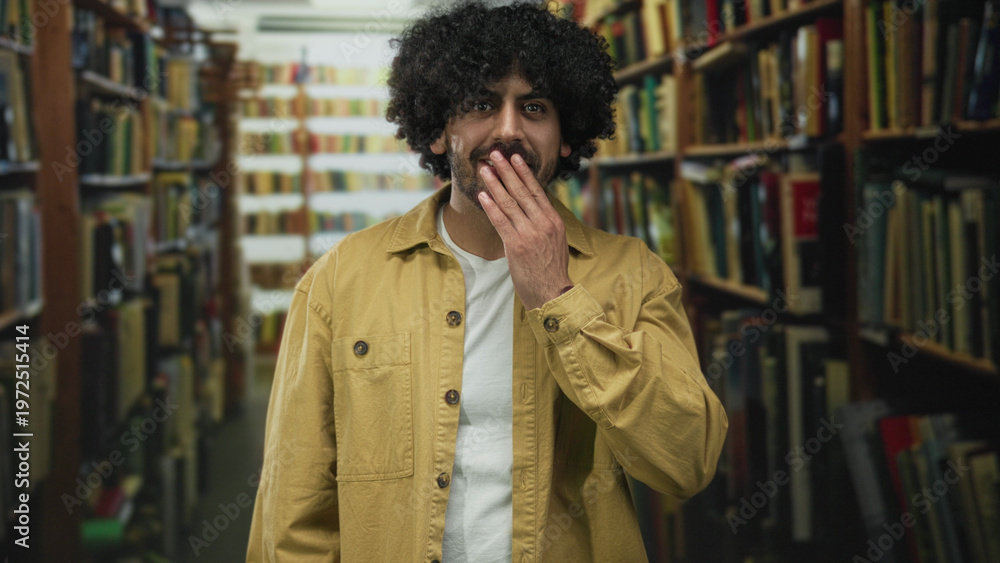 Man with hand to mouth standing in a library building aisle among bookshelves, wearing jacket and tshirt, mouth open; surprise curiosity. #1972515414