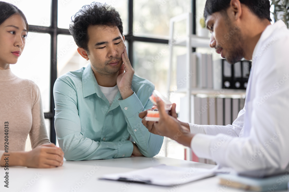 Man with toothache consults with doctor in examination room. Dentist demonstrating an anatomical model of the human jaw while explaining treatment options to a patient in a dental clinic. #1924040313