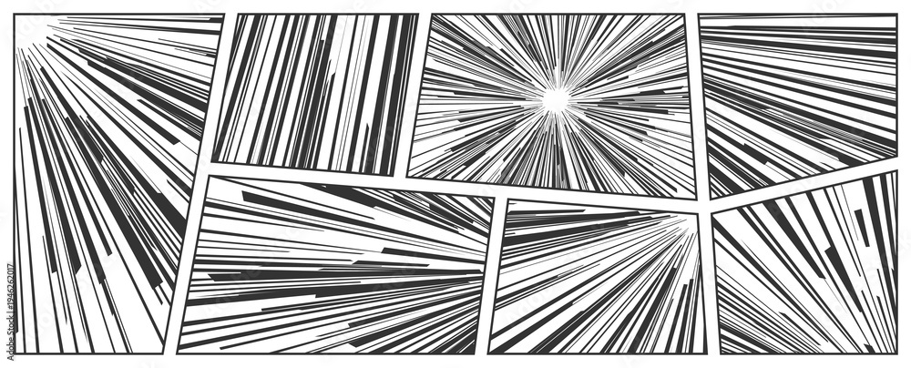 Manga anime comicbook speed lines set. Black and white radial impact effects and comic book action energy. Sun burst focus, lightning shock overlays and concentric screentone style. Vector background. #1946262017