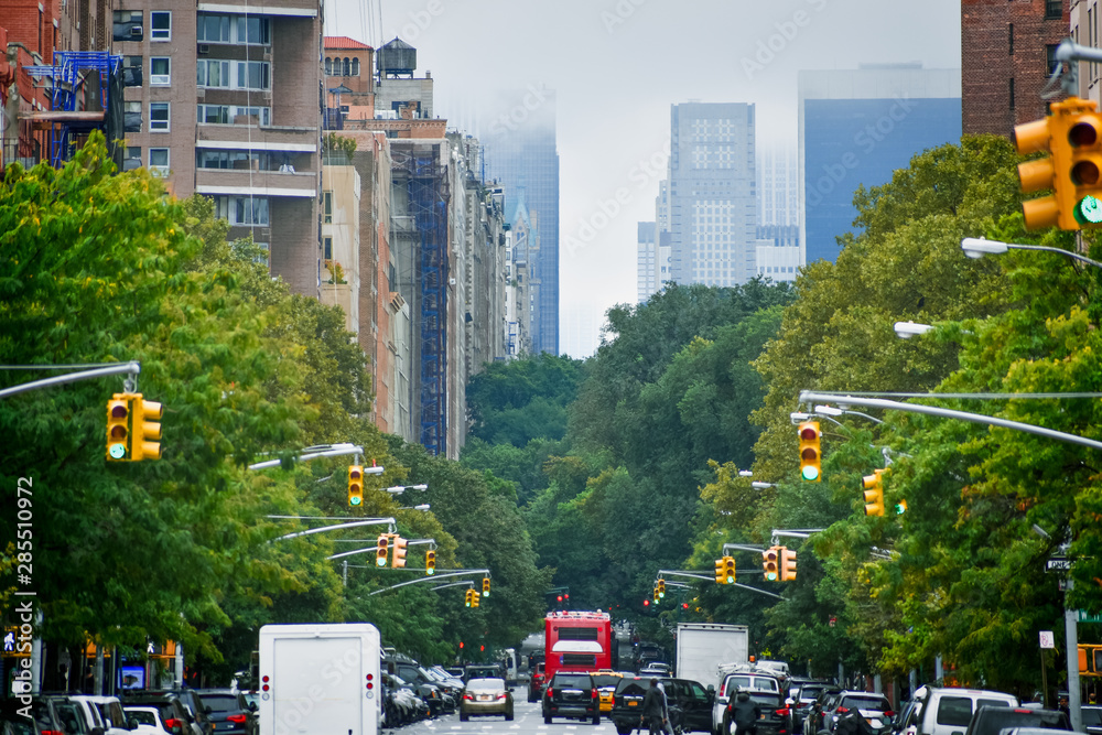 Manhattan buildings skyline from 5th ave. Harlem in a foggy day, through the trees and traffic lights. NYC, USA. #285510972