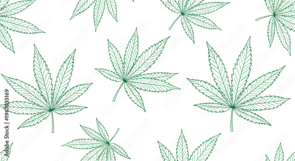 Marijuana leaf seamless pattern in green line art style on white background for herbal medicine or botanical themes. #1967035169