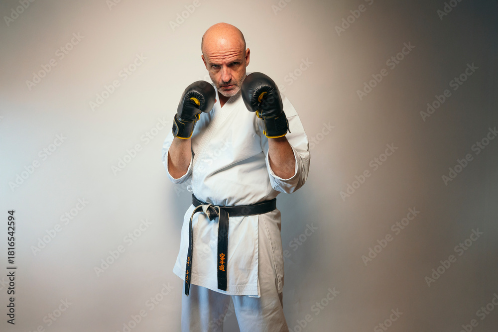Martial artist holding high guard with black gloves. #1816542594