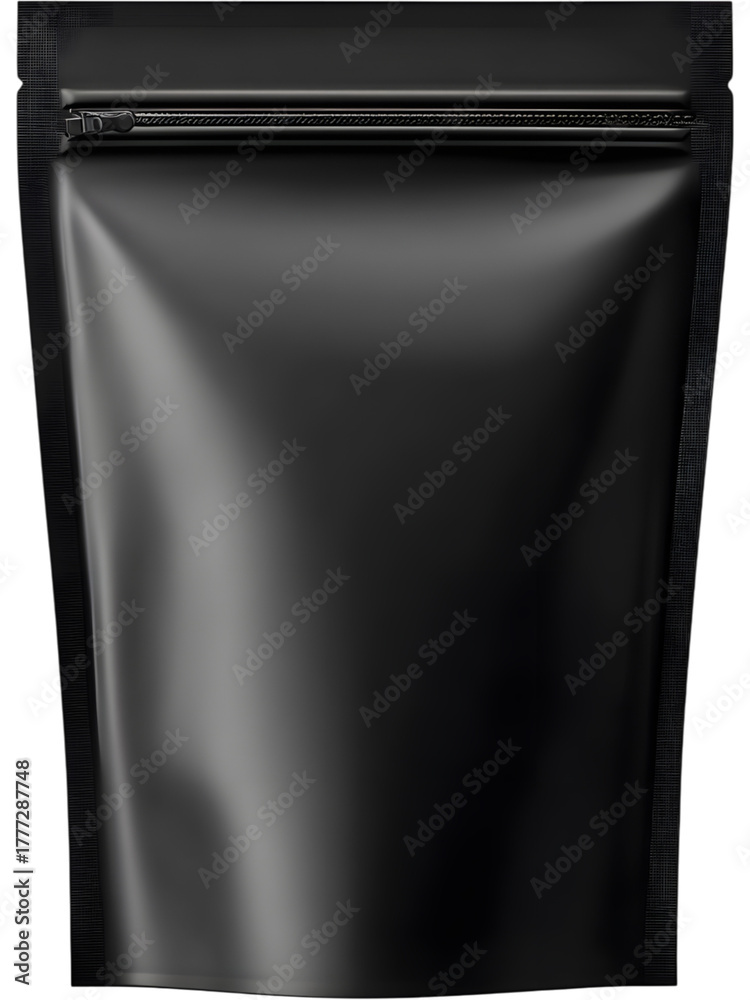 Matte black stand-up pouch mockup isolated on transparent background, ideal for product branding and packaging design.. #1777287748
