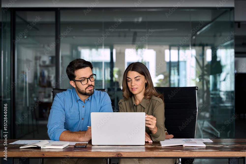 Mature executive manager talking to colleague explaining online project results having discussion at meeting. Two busy business people entrepreneurs team checking data using laptop at work in office. #1512844086