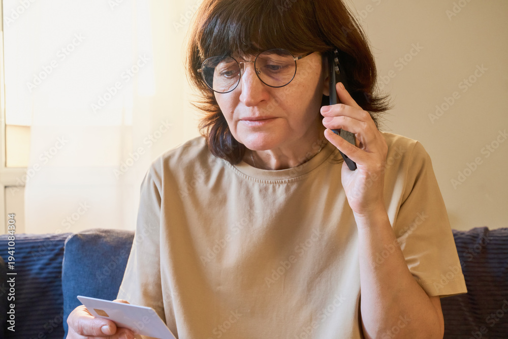 Mature woman making phone call, holding credit card with concerned expression #1941084304