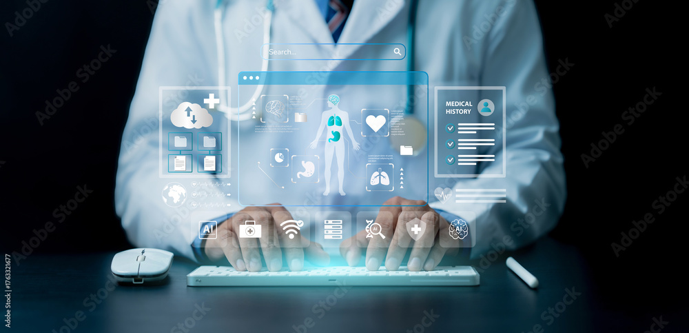 Medical Health Cloud data Concept. A doctor analyzing with a tablet and laptop, accessing medical cloud data via holographic interfaces displaying patient information, AI and medical technology. #1763321677