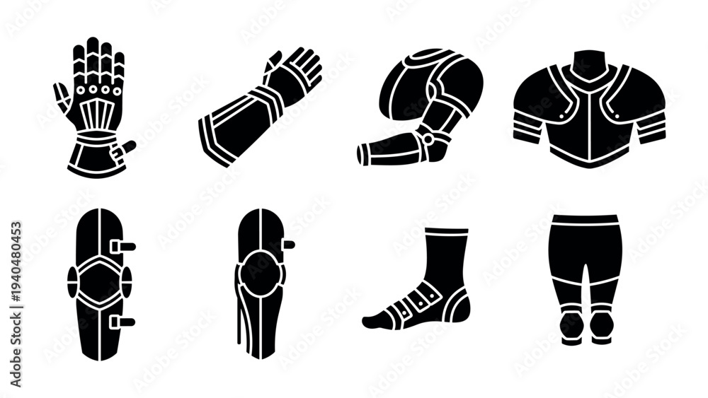 Medieval armor silhouette set: detailed glove, arm, shoulder, knee, leg guards #1940480453