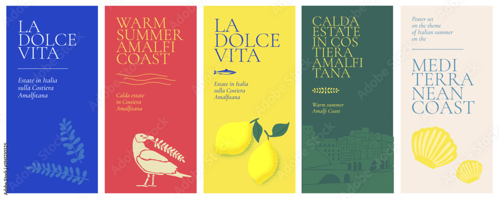 Mediterranean summer vibes vertical banners. Retro Italian lemons, olives and seagull. Amalfi coast pattern for invitations. Italian text translate: The sweet life, Summer in Italy on Amalfi Coast. #1961210325