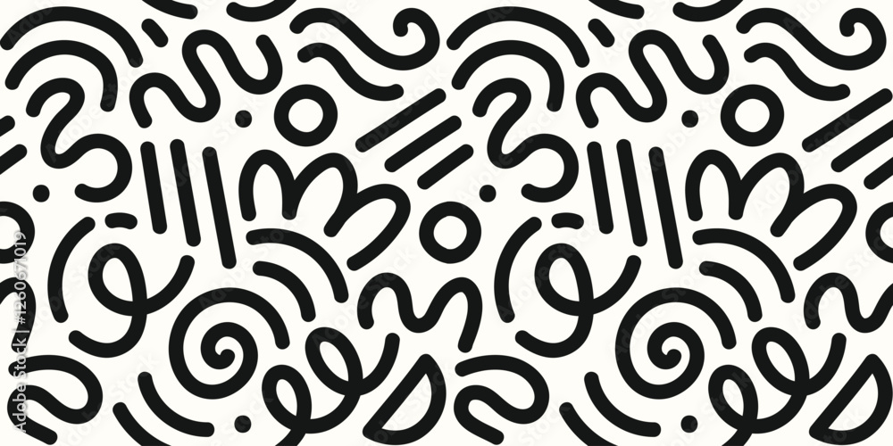Memphis geometric seamless pattern. blue and white abstract background in retro 80s, 90s style with various shapes: circles, semicircles, dots, zigzags, spirals, wavy lines. Cute kid doodle design. #1260671019