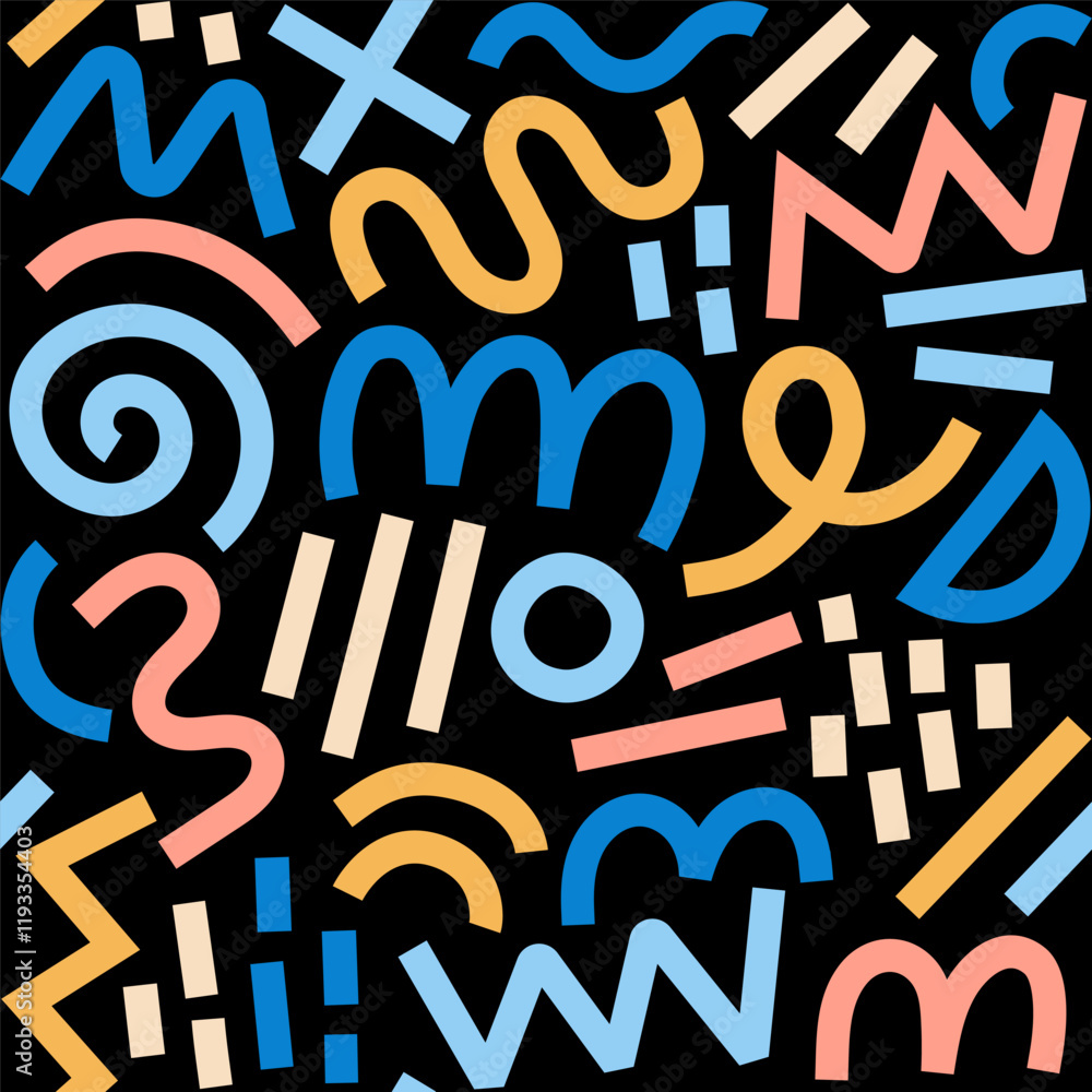 Memphis geometric seamless pattern. Multicolor abstract background in retro 80s, 90s style with various shapes: circles, semicircles, dots, zigzags, spirals, wavy lines. Cute kid doodle design. #1193354403
