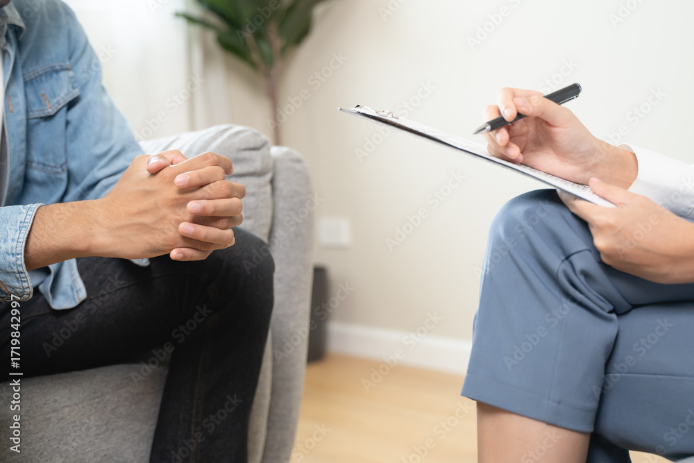 mental health care therapy concept, psychologist counseling to anxiety patient and giving guidance mental therapy care to cure mental health. #1719842997