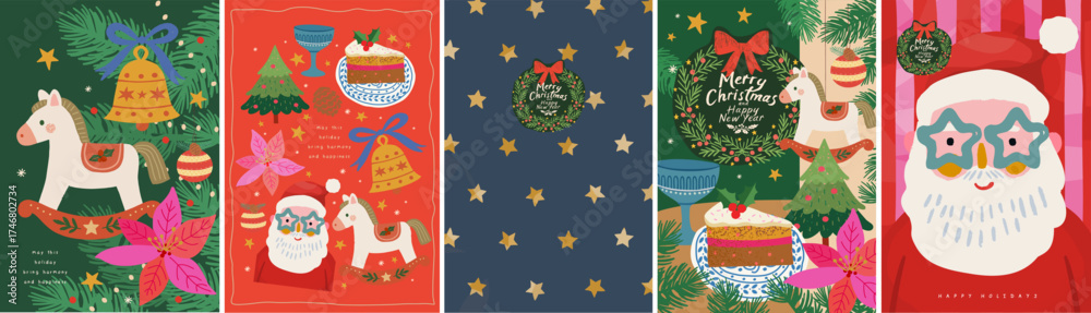 Merry Christmas and Happy New Year 2026. Vector illustration of Santa Claus, Christmas tree, cake, flower poinsettia, pattern, stars, decorations, wreath, bell, horse, festive table for greeting card #1746802734