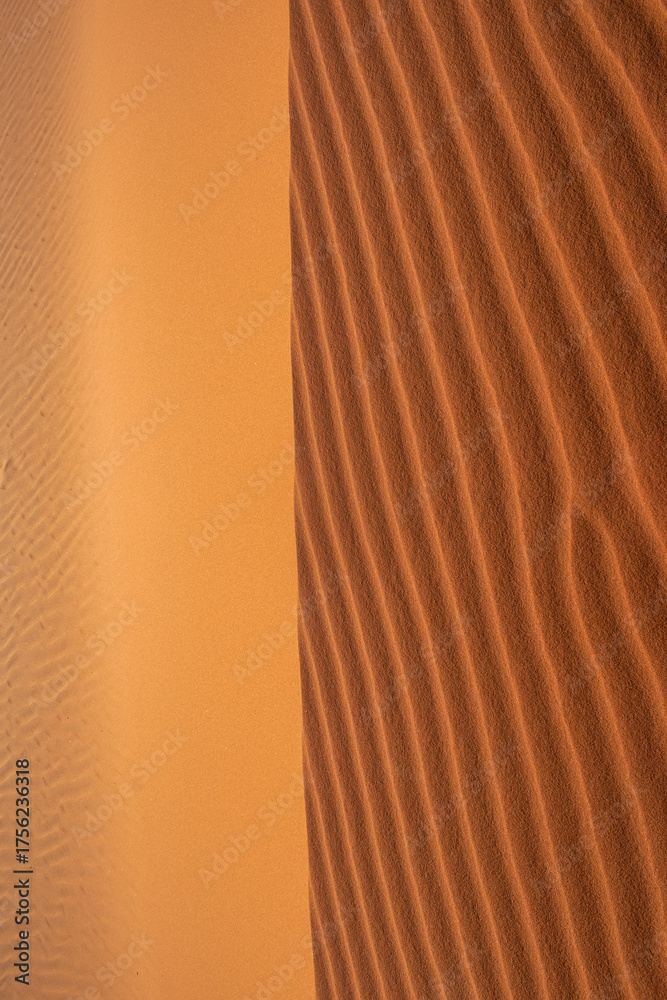 Merzouga, Morocco, Africa: close up and details of Erg Chebbi dunes, view of a dune in the Sahara desert, grains of sand forming small waves on the beautiful dunes at sunset #1756236318