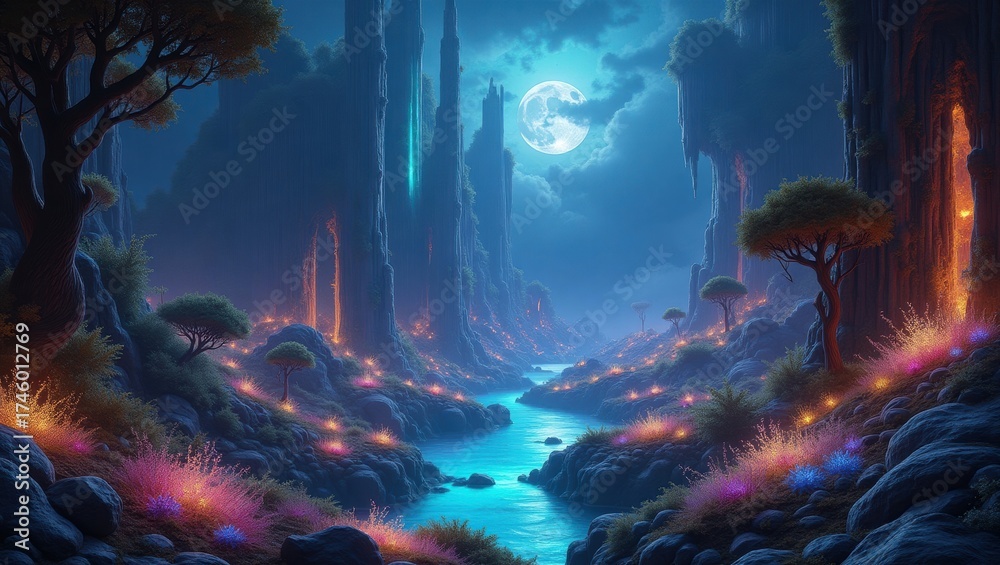 Meteor impact crater transformed into a bioluminescent forest teeming with alien wildlife and crystalline pools #1746012769