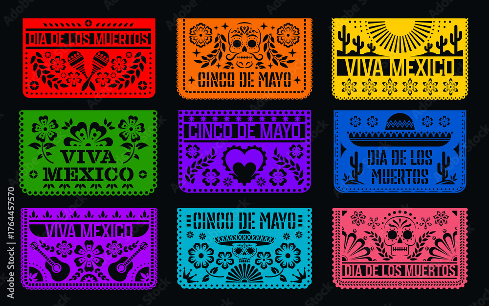 Mexican paper cut day of the dead papel picado flags for holiday decorations, vector banners. Mexican fiesta party papel picado flags with paper cut Catrina calavera skull and Viva Mexico guitars #1764457570