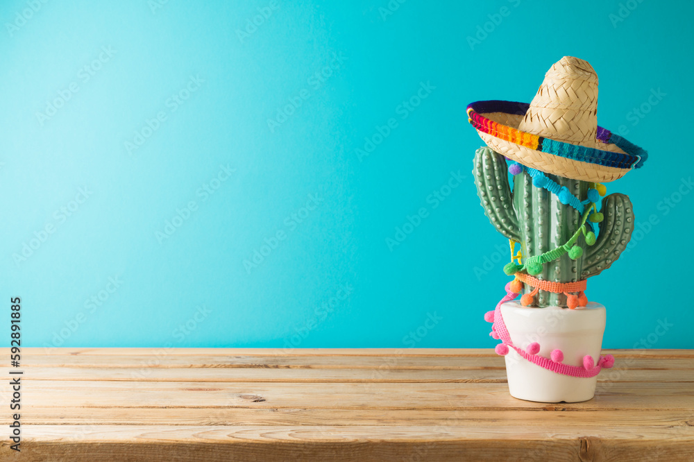 Mexican table decoration with cactus and sombrero hat over blue background. Cinco de Mayo holiday celebration #592891885