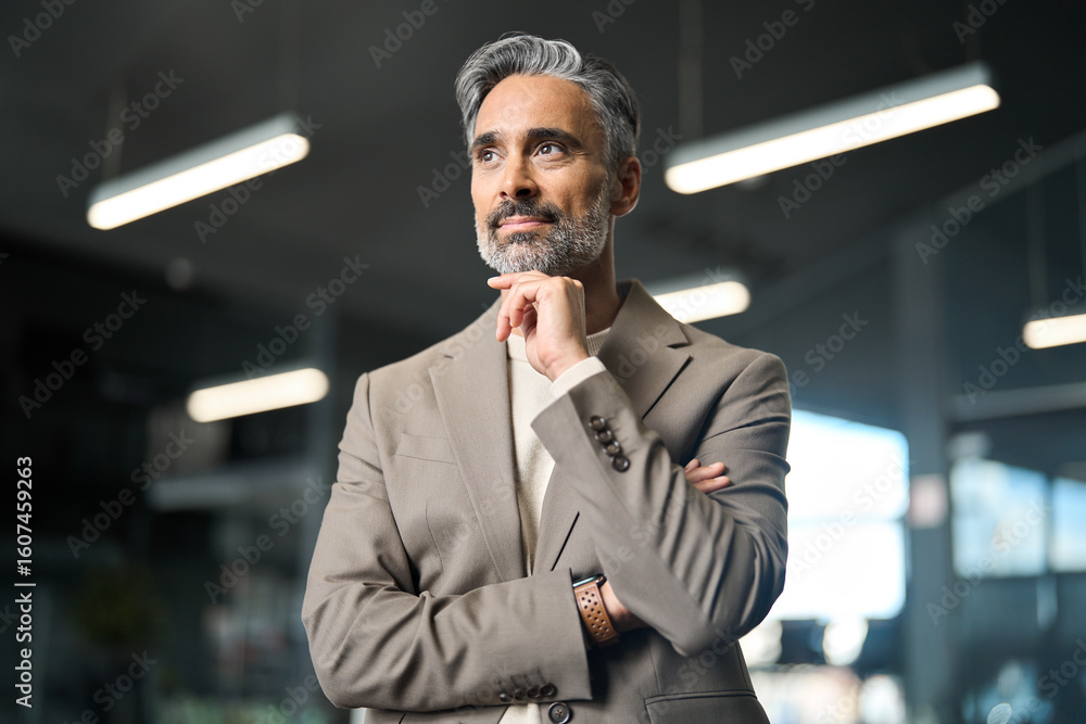 Middle aged businessman ceo executive leader wearing suit holding hand in chin at work thinking on future question. Serious mature 45 years old business man investor standing in office looking away. #1607459263