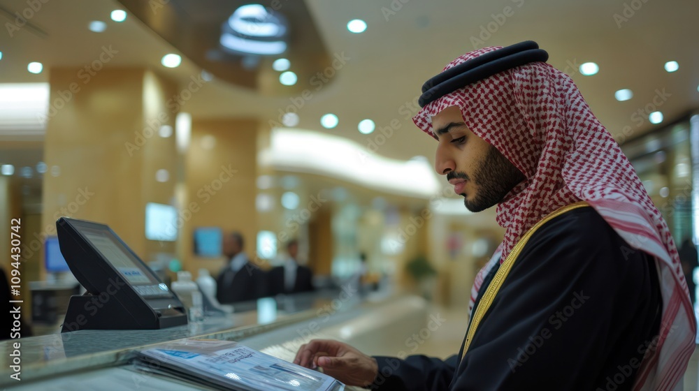 Middle Eastern man applying for a personal loan at a financial center in Riyadh, Saudi Arabia #1094430742