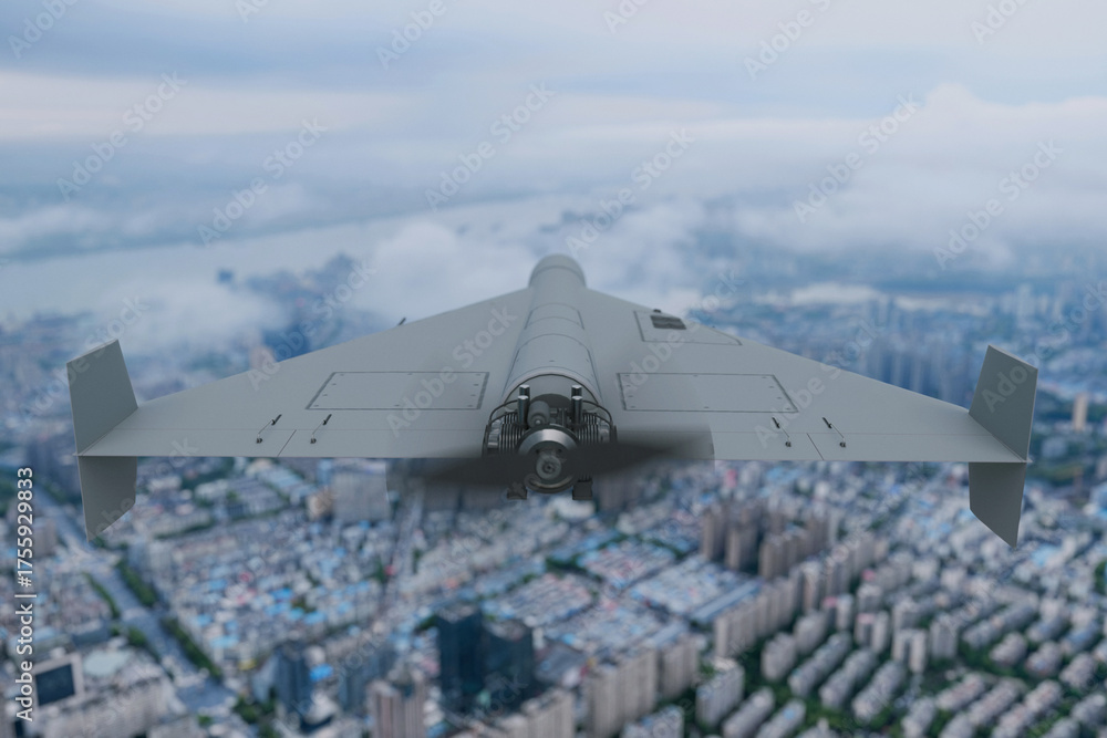 Military drone armed with explosives flies high above a city. Attack, concept. Modern warfare with drones and unmanned aerial vehicles. #1755929833
