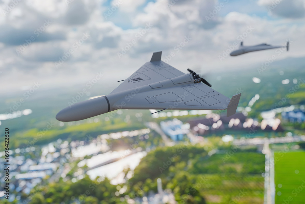 Military drone in flight over landscape, showcasing modern unmanned aerial vehicle technology used for surveillance, defense, and reconnaissance missions against a backdrop of fields and clouds #1696422620